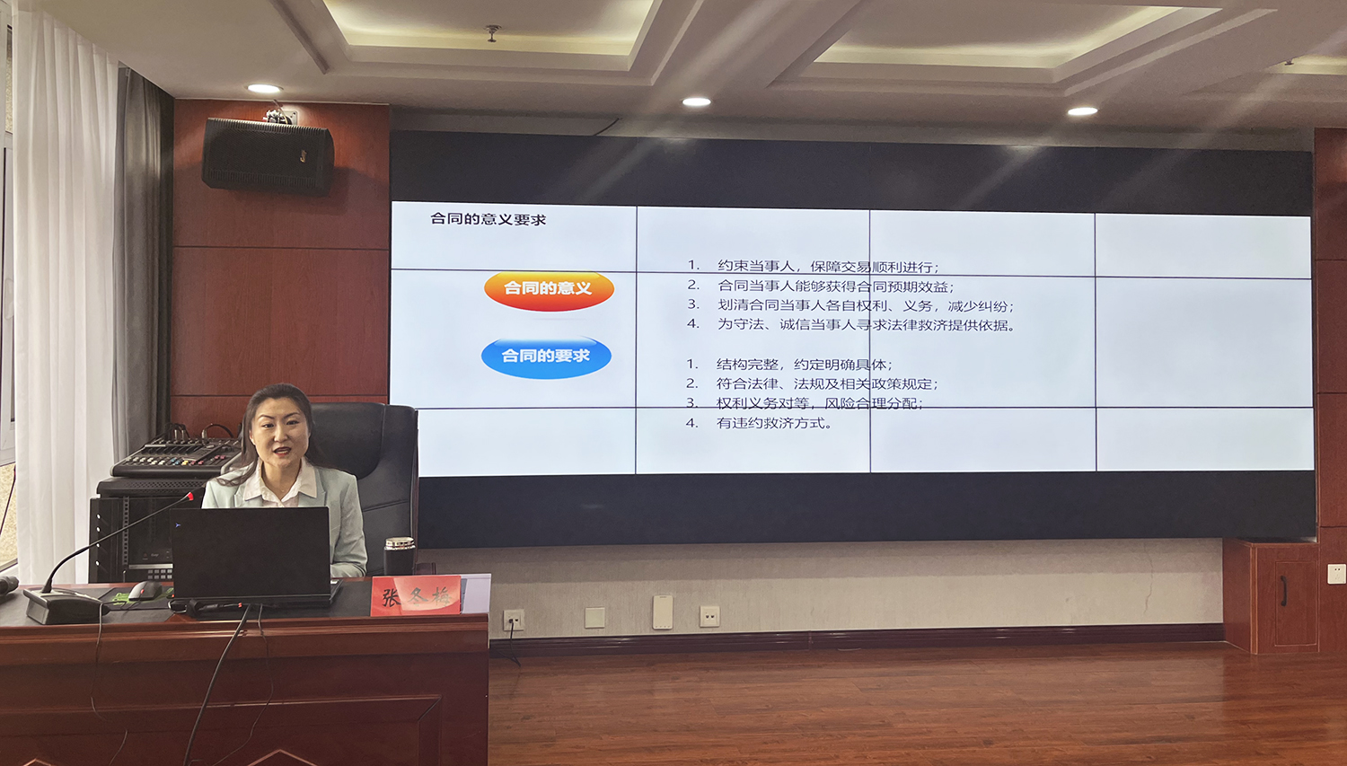 本次培訓(xùn)會議特邀集團(tuán)公司常年法律顧問、河北德律律師事務(wù)所張冬梅律師就《民法典》合同編部分做了專題講解,張冬梅律師圍繞合同的意義、合同的基本結(jié)構(gòu)、合同效力的規(guī)定、審查合同應(yīng)注意的問題等內(nèi)容做了精彩的授課,并對相關(guān)問題進(jìn)行了解答。