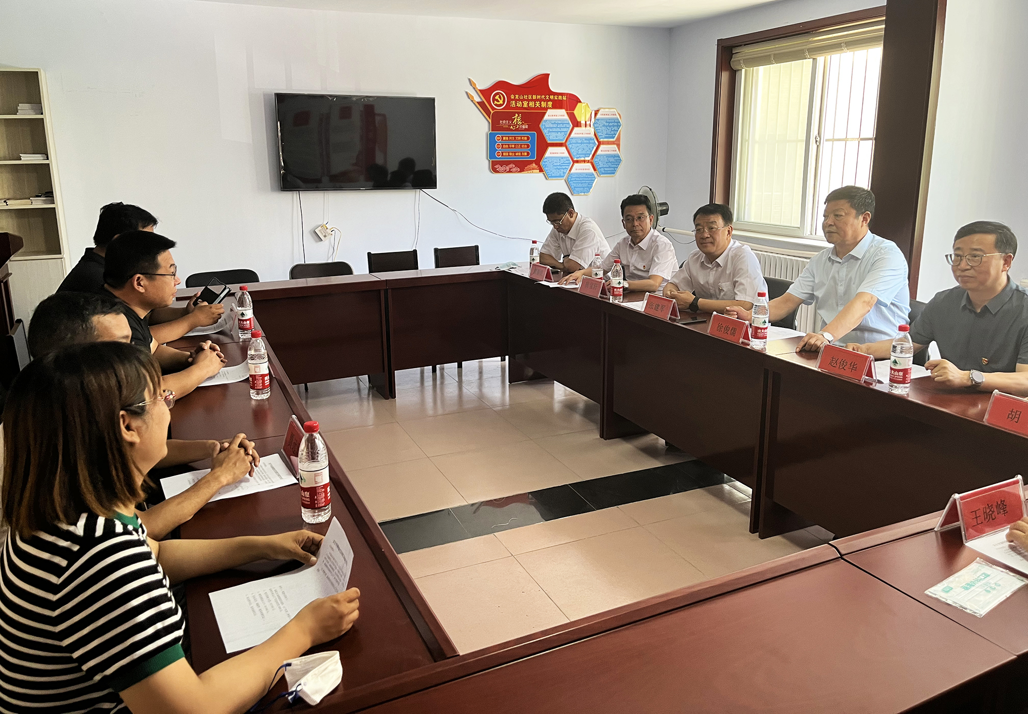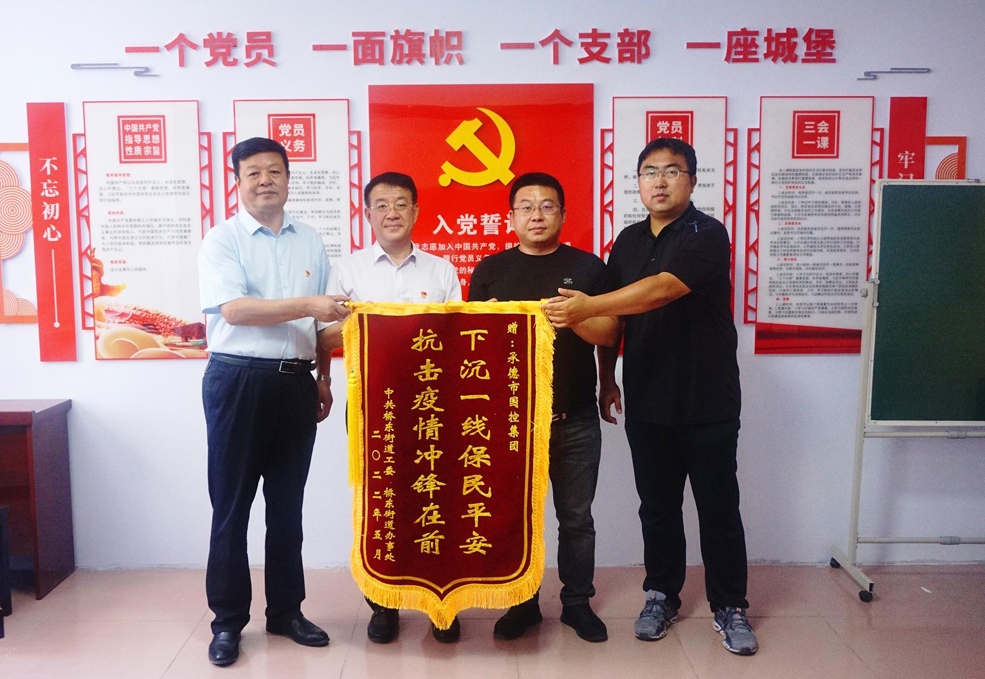 捐贈儀式后,國控集團領導班子與橋東街道、會龍山社區(qū)主要負責人,就結(jié)對幫建工作進行座談,詳細了解了創(chuàng)城工作開展情況、存在問題及下一步打算,針對社區(qū)基礎設施不完善、公共停車泊位施劃不合理、樓道雜亂和小廣告亂貼等問題,研究制定了具體舉措。會上,為感謝國控集團在抗擊疫情和結(jié)對幫建工作中的大力支持,橋東街道、會龍山社區(qū)向集團公司贈送了“下沉一線保民平安、抗擊疫情沖鋒在前”錦旗。