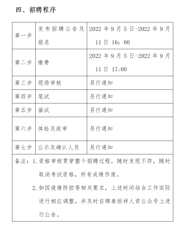 ?2022年9月5日-2022年9月11日16:00 在錦泰恒祥人資官網(wǎng)(www.jthxhr.com)、“錦泰恒祥人力資源服務(wù)有限公司”微信公眾號、“國控集團(tuán)”官方網(wǎng)站(m.sangaole.com)及上級部門要求的相關(guān)網(wǎng)站等發(fā)布招聘公告。