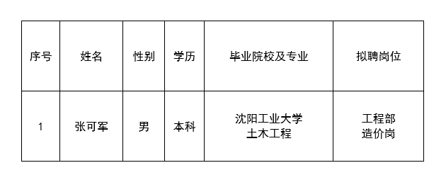 因公司發(fā)展需要,承德市國越房地產(chǎn)開發(fā)有限公司委托第三方機(jī)構(gòu)面向社會公開工程部造價崗員工1名。現(xiàn)對擬錄用人員信息進(jìn)行公示,公示期間如有異議,可通過電話、信函等方式反映,反映意見請署真實(shí)姓名。