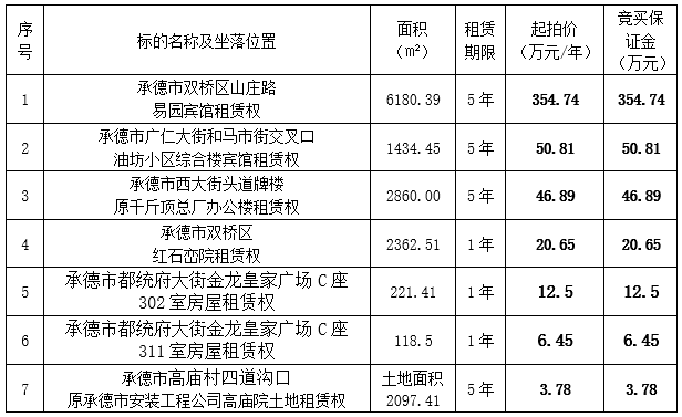 我集團(tuán)全資子公司承德市國控資產(chǎn)運營有限公司、承德市國瑞物業(yè)管理有限公司委托河北福成拍賣有限公司,定于2020年1月21日上午9時在承德市雙橋區(qū)武烈路6號紫御國際假日酒店會議室公開拍賣下列標(biāo)的,現(xiàn)將有關(guān)事項公告如下: